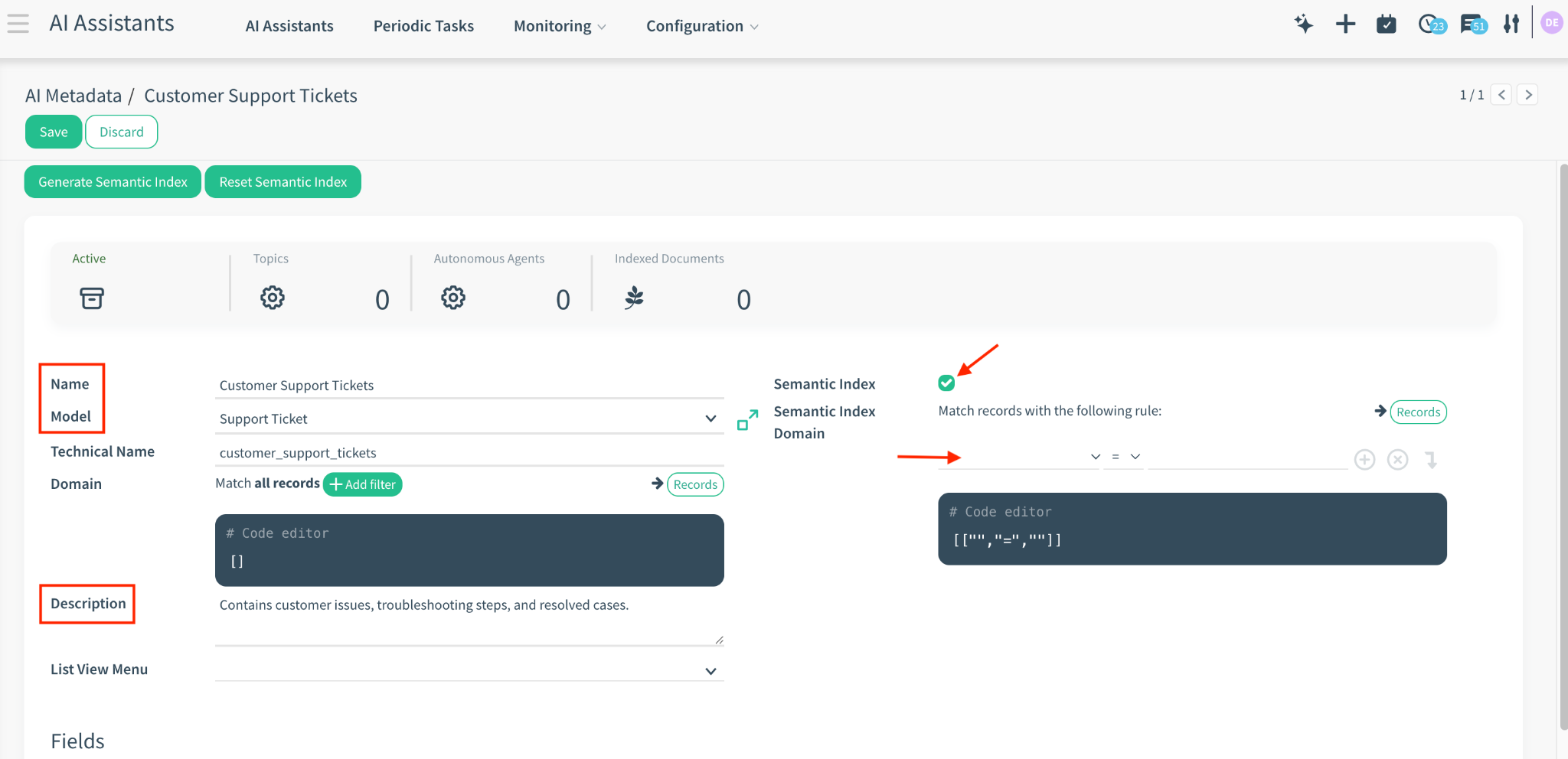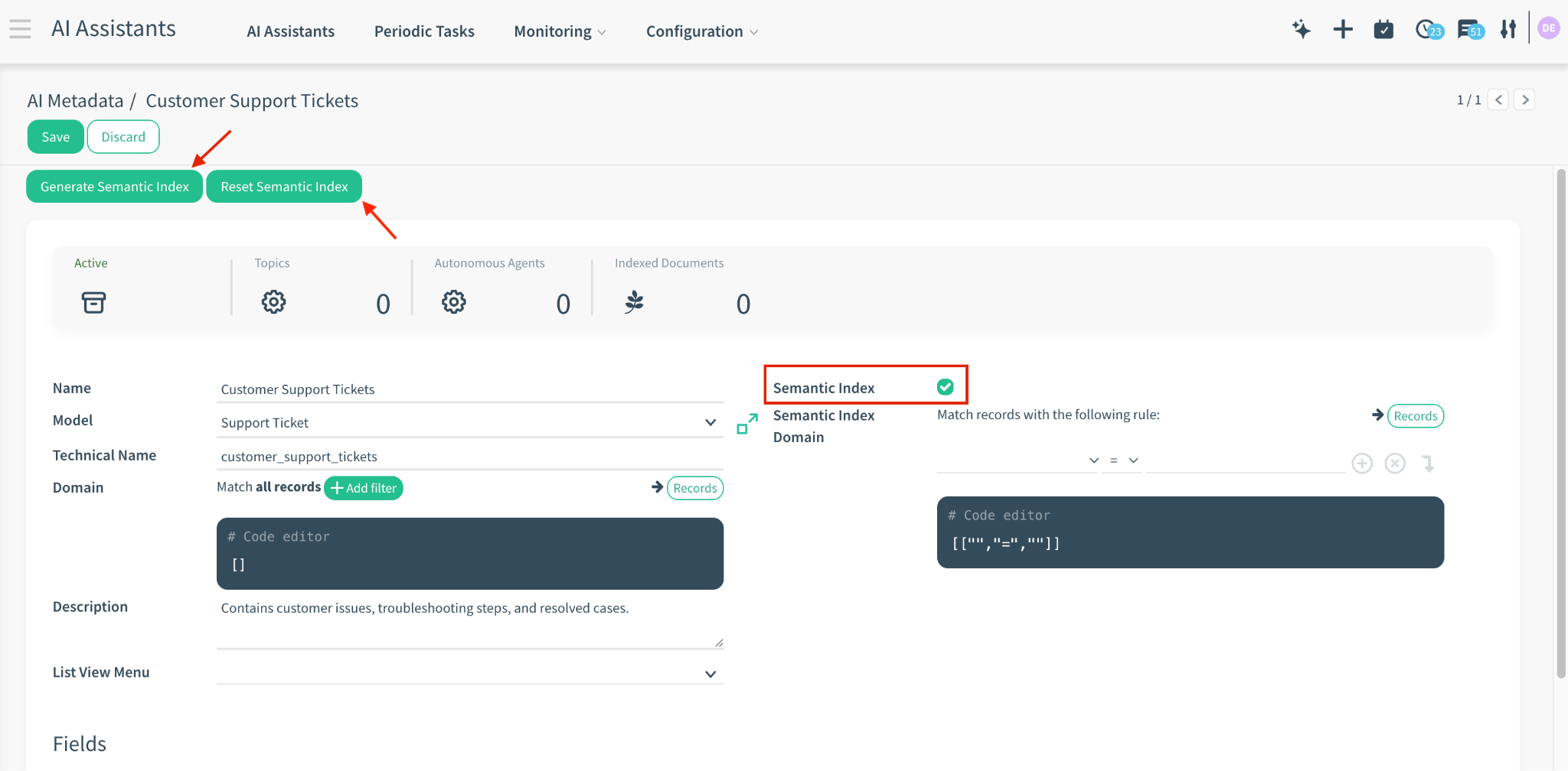 5. Semantic Index Domain: (Optional) Add a domain filter to limit which records are indexed (e.g., [('active', '=', True)] to exclude archived records).